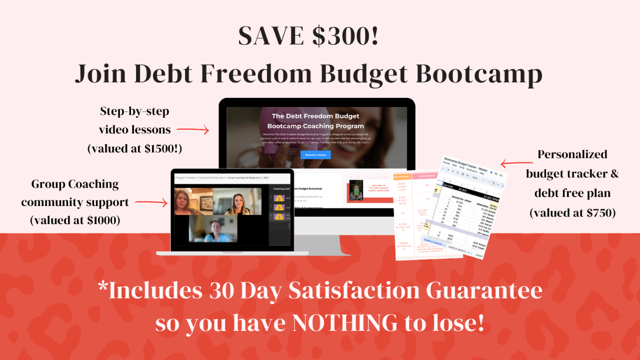 Don’t let another day go by stressing about your finances. The Debt Freedom Budget Bootcamp system was created to help you take control of your money life for good! SAVE $300 now!